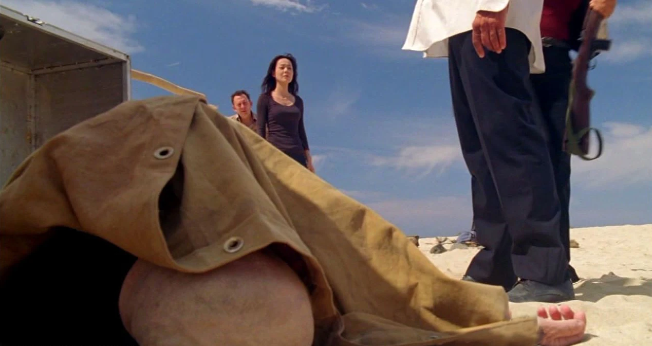 A crab is seen resting behind Locke's corpse's ear. It scurries off when Frank covers the corpse with a tarp, noting that Locke is "getting ripe." When Sun tells Ilana that the other people have gone to the Temple, Ilana urges the rest (Sun, Frank, and Ben) that they should also go there, as it is the safest place on the Island. Sun is sceptical until Ilana suggests that if Jin is alive and on the island, he is also at the Temple. ♪ Before they leave, Sun says they need to bury John.