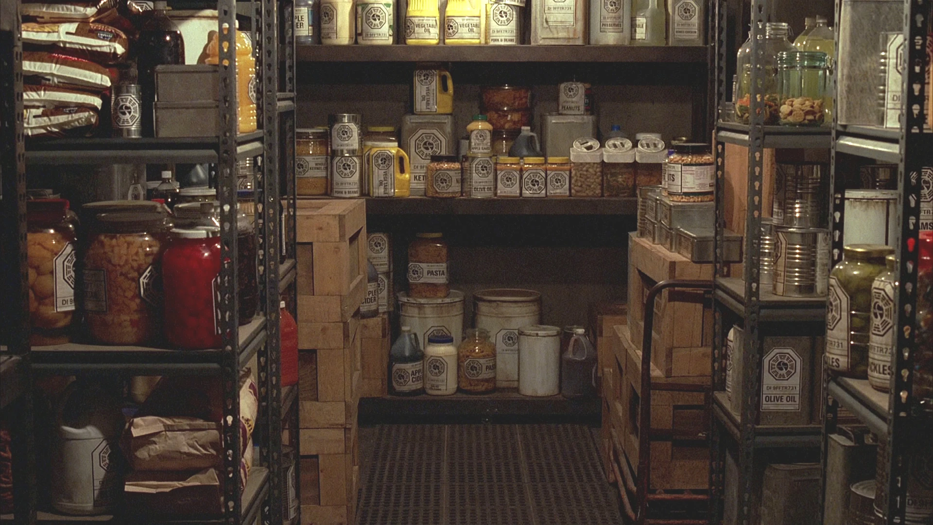 The pantry was opposite the living space's lounge area. The pantry's shelves were well stocked with food and other supplies from the periodic resupply drop, including notable products such as Apollo Bars, DHARMA Ranch Composite, peanut butter, and shampoo. ("Orientation") ("Everybody Hates Hugo")