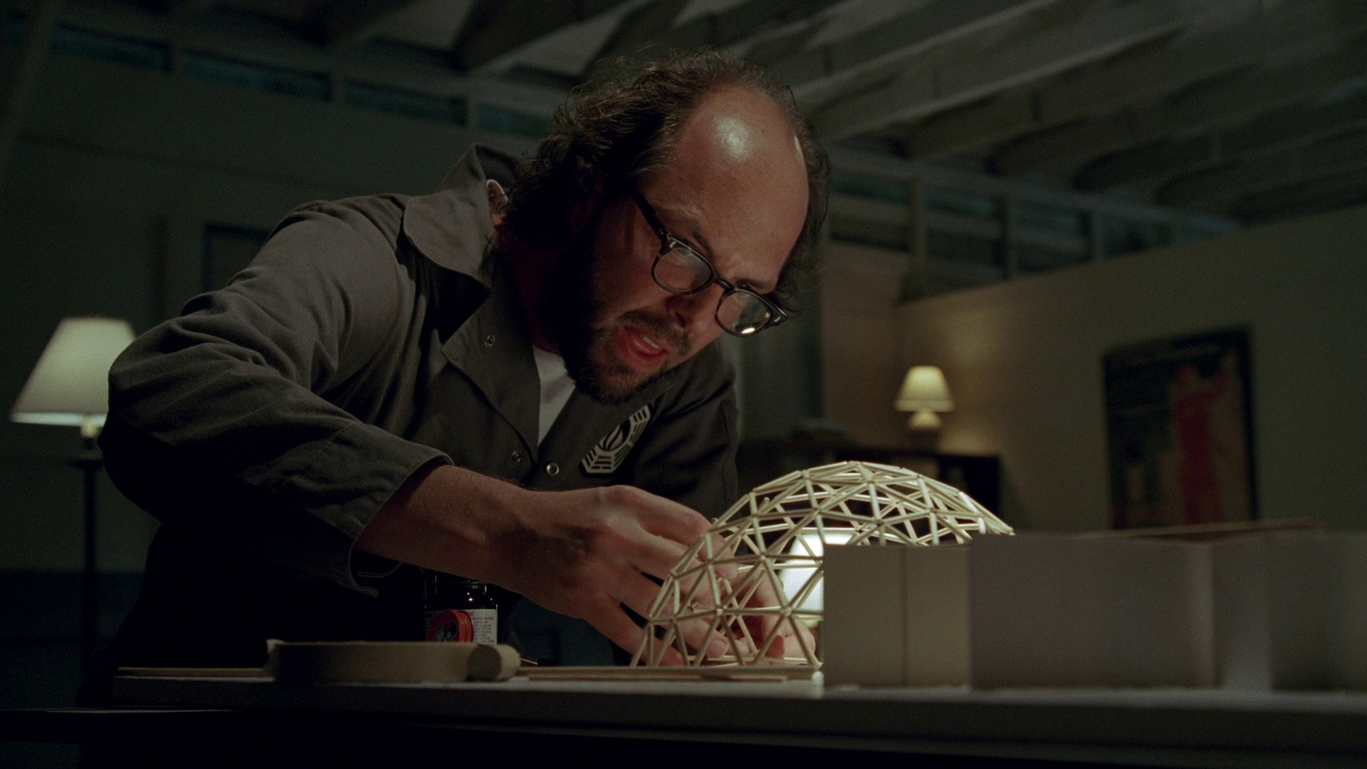 Radzinsky builds a scale model of the geodome on a set of Swan blueprints.
