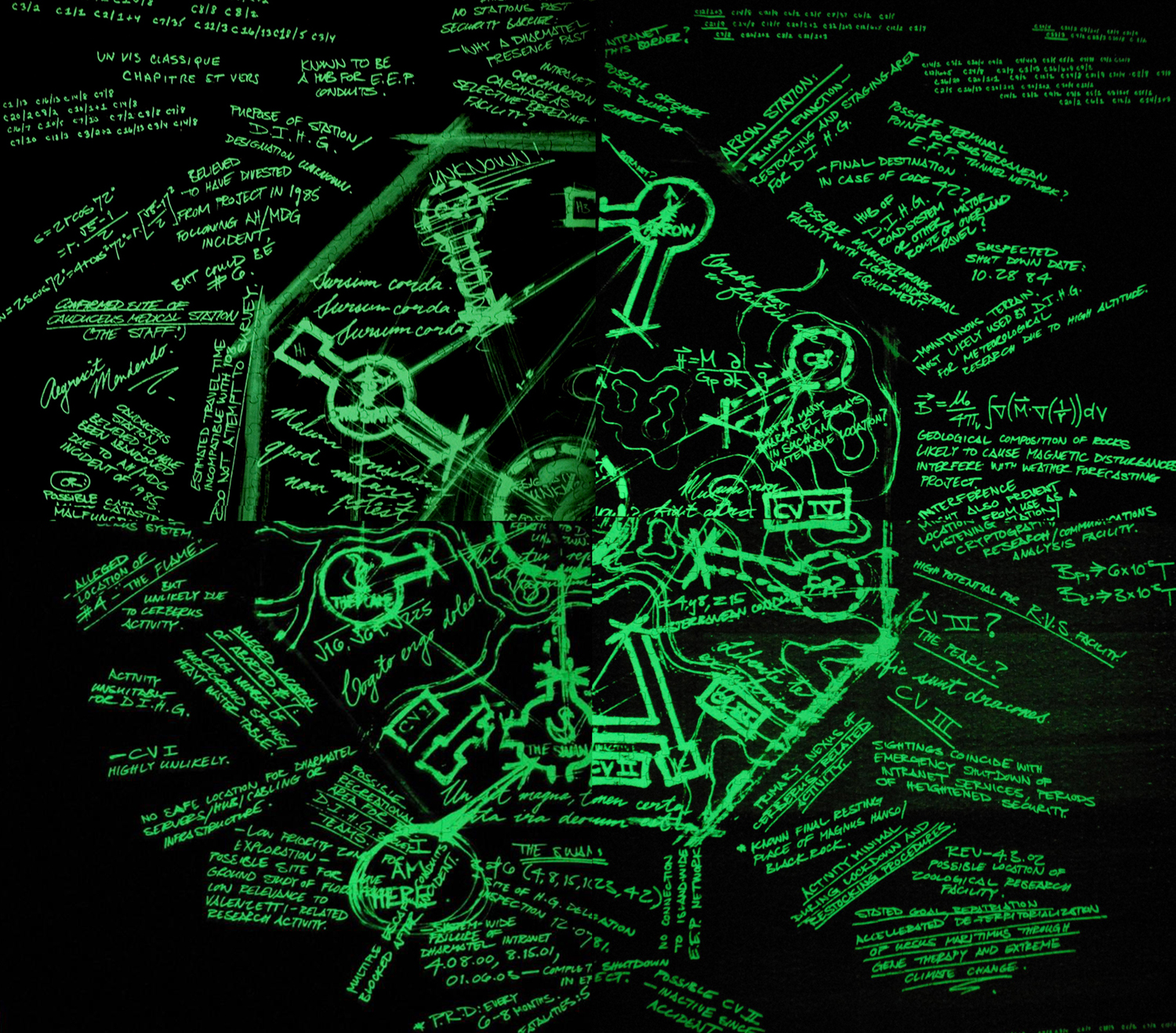 During "Lockdown", a lockdown incident occurred unexpectedly. Locke was trapped beneath one of the blast doors while Ben crawled through the vents seeking to push the button before the timer expired. The station's normal lighting cut out entirely and a different set of ultraviolet "black-lights" turned on. The new lighting revealed a large hand-drawn map on the blast door entering the living quarters. The map appeared to be of the Island, supplemented with numerous equations and notations written in English and Latin. ("Lockdown") In the video game Lost: Via Domus, there was a second layer of notation that could be seen under different lighting conditions. This "second spectrum" of the map included additional information regarding other island locations including the Barracks, the Hydra, and the Looking Glass. ("Forty-Two")