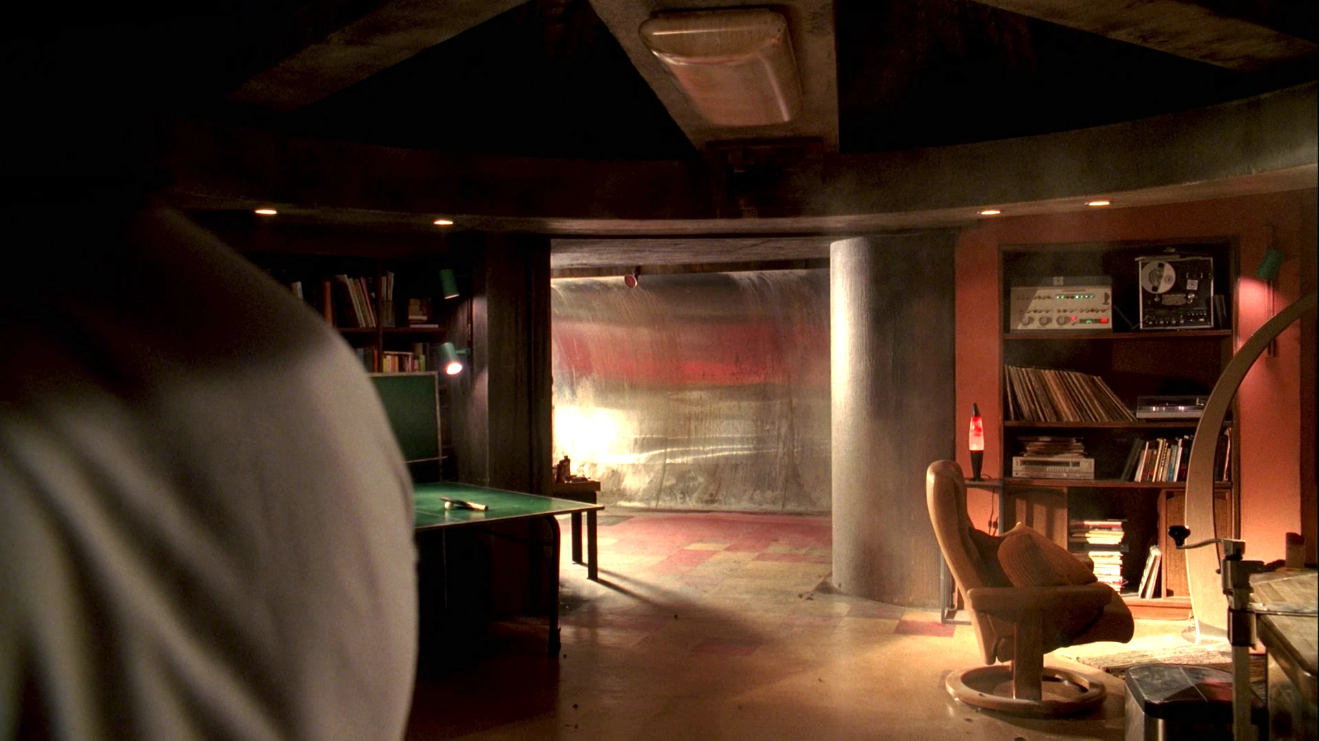 The living space was the largest part of the Swan - where the occupants of the station would spend their time when not working. This area had many conveniences: a bedroom with a set of bunk beds, a bathroom with working shower and hot running water, miscellaneous exercise equipment, a washer and dryer, a dining nook, a central kitchen area equipped with an oven, stove-top, and sink, and a lounge area equipped with a record player, LP collection, lava lamp, well stocked bookshelves, a ping-pong table, and a painting of a tree. A small cabinet contained an injector and a number of vials of a strange DHARMA vaccine. On the ceiling near the armory was a blood stain from Radzinsky's suicide.