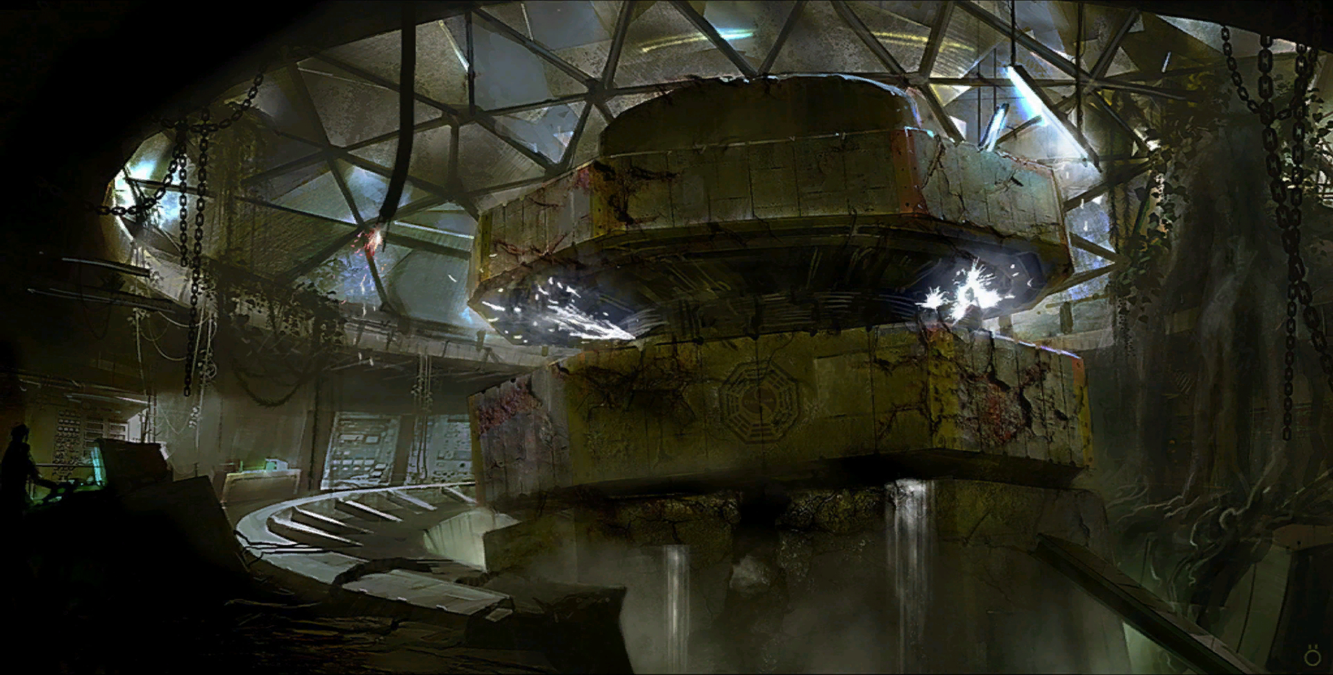 The room contained a large reactor surrounded by severely damaged equipment. The reactor was tilted to one side, and was discharging arcs of electricity and a watery fluid. The reactor had the appearance of two large electromagnetic coils suspended over an excavation into the Island. Unlike the rest of the Swan, the Incident Room's machinery was in a state of disrepair, possibly due to the Incident. The Incident Room also had its own computer. ("Hotel Persephone")