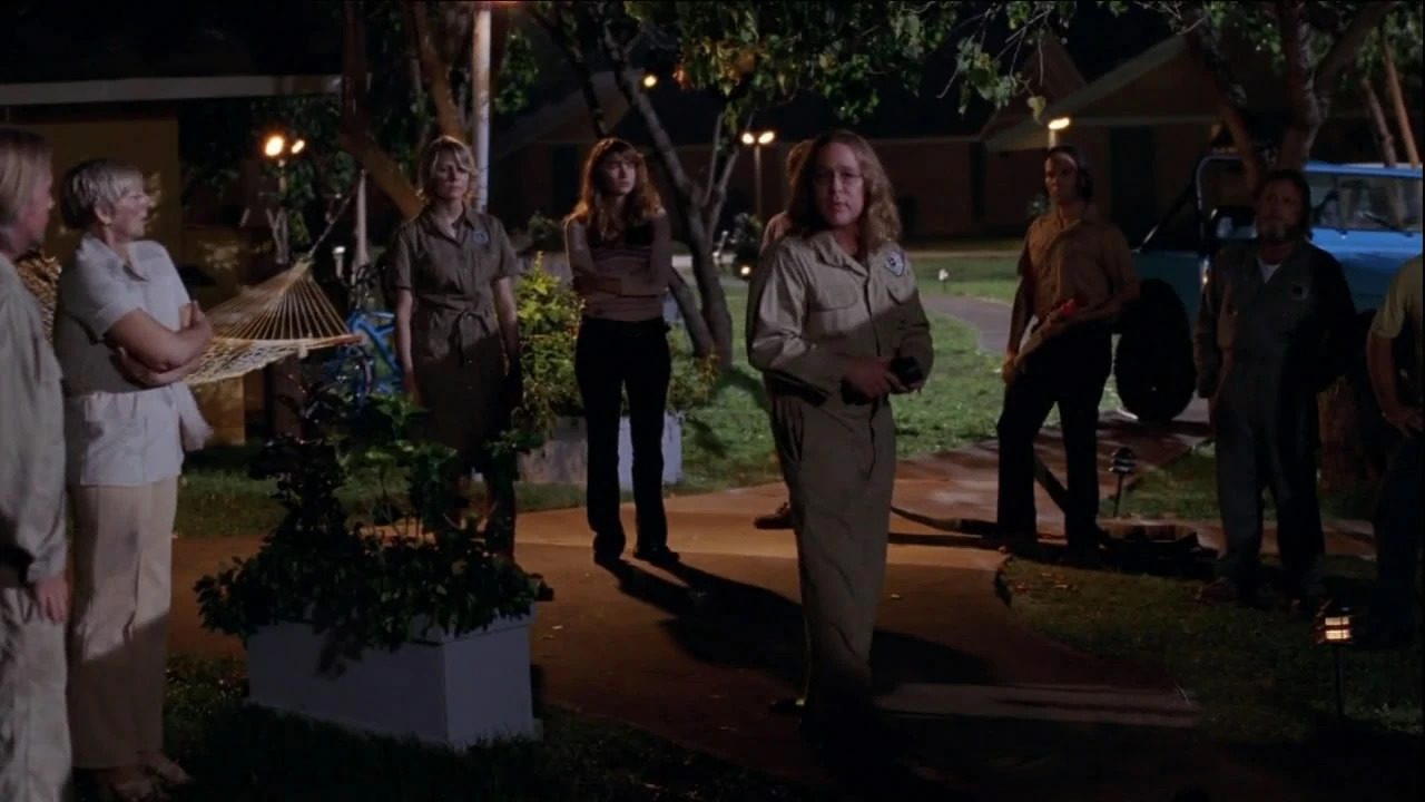 At the Barracks, Horace briefs the gathered DHARMA personnel on the prisoner's escape. ♪ When Jack steps forward to ask questions, Horace regards him suspiciously and states that the prisoner must have had help from "one of us" since no Hostiles were seen crossing the fence. Later, Roger Linus approaches Kate and asks for her help operating a winch to move the burned DHARMA van. Roger and Kate seemed to have a connection as they talked. Jin arrives and, as he carries Ben to get aid, Roger sees his injured son and runs after them.