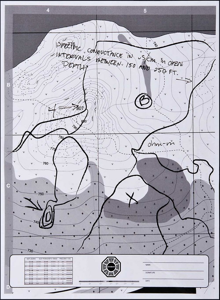 Zoe showed Jin a grid map which the DHARMA Initiative used to identify pockets of electromagnetism. It appeared that Jin had signed the maps with his own name, "Jin-Soo Kwon", indicating that it was he who had conducted the surveys, and that Widmore's team now required the kidnapped Jin's assistance in making use of the map. Template:Crossref