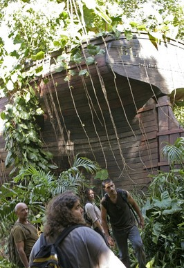 Hurley拒绝听Sawyer谈论Charlie的死,他拉在队伍后面走丢了。这时他听到奇怪的响声和耳语声,然后在丛林中看见了Jacob的小屋木。Hurley小心翼翼地靠近木屋往里探视,他看到一个黑影a man坐在摇椅上。忽然,一只眼睛出现在窗口,Hurley吓得大叫拔腿就跑,谁知跑了一会儿,他居然看到小木屋又出现在自己的眼前,门吱吱地慢慢打开。Hurley闭上眼睛,告诉自己眼前的都是幻觉,再次睁开眼睛,Hurley发现小木屋不见了,于是拔腿又逃,却被绊倒了,抬头一看,出乎意料地看到Locke就在自己跟前。