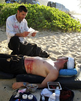 在废墟中徘徊一阵之后, Jack从海滩上的一个手提箱中找到一个针线包,离开废墟去检查身体左侧的伤口。正当他查看的时候,Kate走到附近,于是Jack请求她帮忙缝伤口。缝合过程中,Jack讲述了自己第一次独立做外科手术的经历,使得似乎被吓倒的Kate平静下来。在那次手术中出现紧急情况的时候,Jack通过“让畏惧感涌入”战胜了恐惧心理,但只让这种涌入持续了5秒钟。